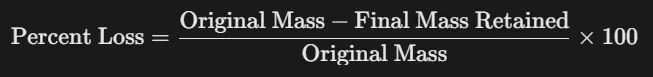 Calculate the percentage loss in mass as the Los Angeles abrasion value using the formula (IS 2386 Part IV, Clause 5.3.5):Los Angeles Abrasion Value (%)=A−BA×100Los Angeles Abrasion Value (%)=AA−B×100